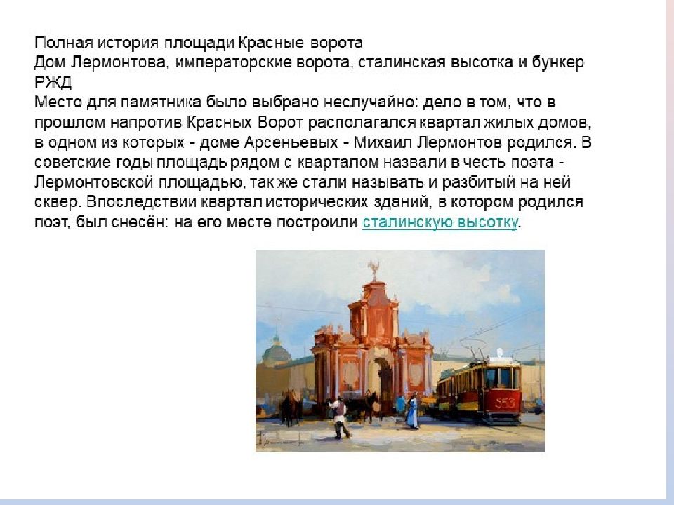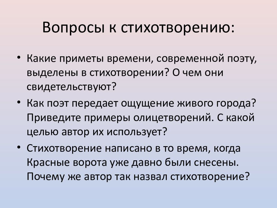 Какие приметы времени, современной поэту, выделены в стихотворении? О чем они свидетельствуют? Как поэт передает ощущение живого города? Приведите примеры олицетворений. С какой целью автор их использует? Стихотворение написано в то время, когда Красные ворота уже давно были снесены. Почему же автор так назвал стихотворение?