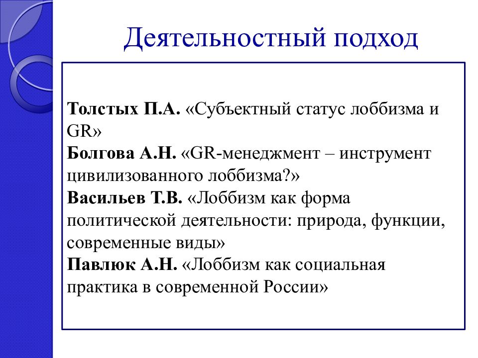 Толстых П.А. «Субъектный статус лоббизма и GR » Болгова А.Н. «GR-менеджмент – инструмент цивилизованного лоббизма?» Васильев Т.В. «Лоббизм как форма политической деятельности: природа, функции, современные виды» Павлюк А.Н. «Лоббизм как социальная практика в современной России»