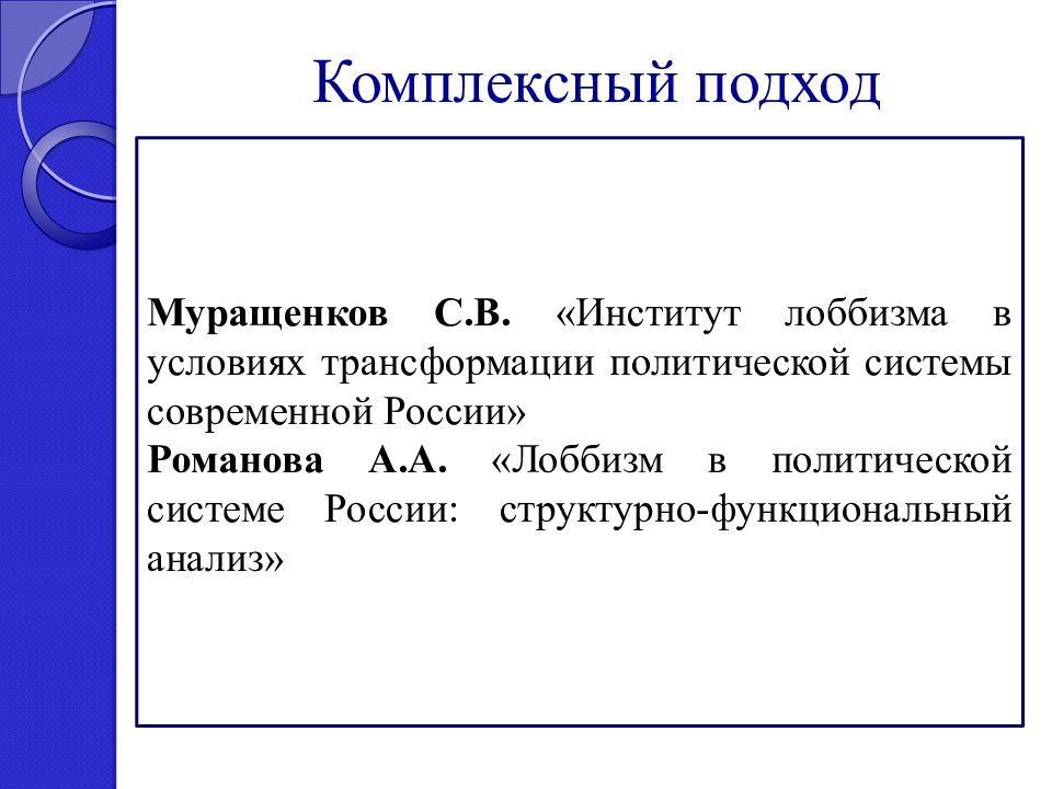 Муращенков С.В. «Институт лоббизма в условиях трансформации политической системы современной России» Романова А.А. «Лоббизм в политической системе России: структурно-функциональный анализ»