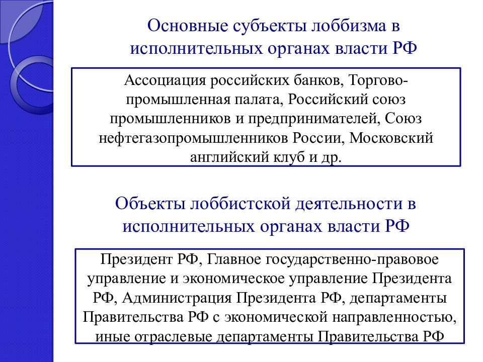 Ассоциация российских банков, Торгово-промышленная палата, Российский союз промышленников и предпринимателей, Союз нефтегазопромышленников России, Московский английский клуб и др. Объекты лоббистской деятельности в исполнительных органах власти РФ Президент РФ, Главное государственно-правовое управление и экономическое управление Президента РФ, Администрация Президента РФ, департаменты Правительства РФ с экономической направленностью, иные отраслевые департаменты Правительства РФ
