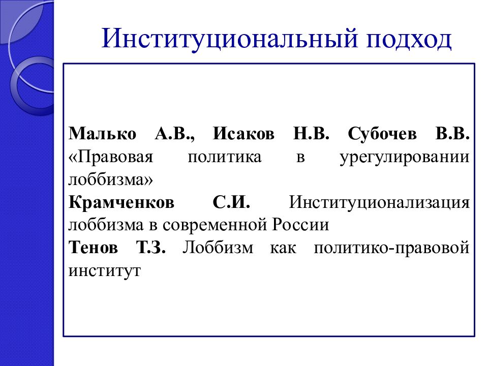 Малько А.В., Исаков Н.В. Субочев В.В. «Правовая политика в урегулировании лоббизма» Крамченков С.И. Институционализация лоббизма в современной России Тенов Т.З. Лоббизм как политико-правовой институт
