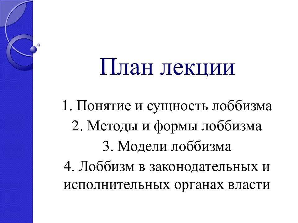1. Понятие и сущность лоббизма 2. Методы и формы лоббизма 3. Модели лоббизма 4. Лоббизм в законодательных и исполнительных органах власти