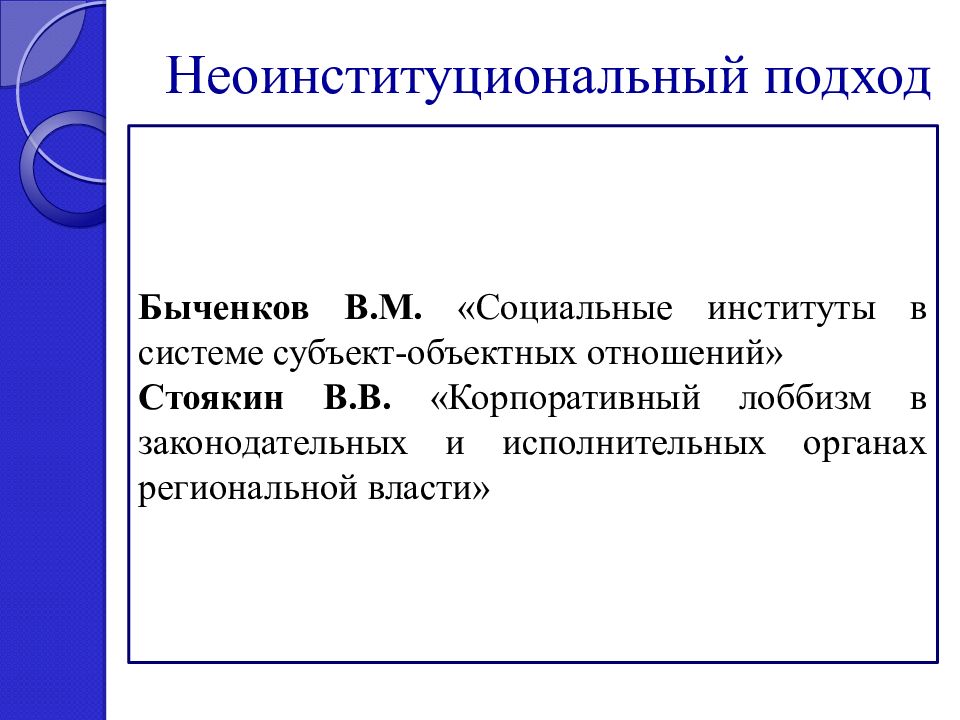 Быченков В.М. «Социальные институты в системе субъект-объектных отношений» Стоякин В.В. «Корпоративный лоббизм в законодательных и исполнительных органах региональной власти»