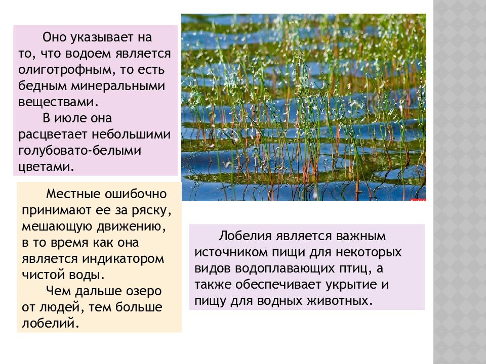 Оно указывает на то, что водоем является олиготрофным, то есть бедным минеральными веществами. В июле она расцветает небольшими голубовато-белыми цветами. Лобелия является важным источником пищи для некоторых видов водоплавающих птиц, а также обеспечивает укрытие и пищу для водных животных. Местные ошибочно принимают ее за ряску, мешающую движению, в то время как она является индикатором чистой воды. Чем дальше озеро от людей, тем больше лобелий.