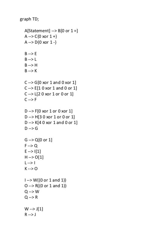 graph TD; A[Statement] --> B[0 or 1 =] A --> C{0 xor 1 +} A --> D{0 xor 1 -} B --> E B --> L B --> H B --> K C --> G[0 xor 1 and 0 xor 1] C --> E[1 0 xor 1 and 0 or 1] C --> L[2 0 xor 1 or 0 or 1] C --> F D --> F[0 xor 1 or 0 xor 1] D --> H[3 0 xor 1 or 0 or 1] D --> K[4 0 xor 1 and 0 or 1] D --> G G --> Q[0 or 1] F --> Q E --> I[1] H --> O[1] L --> I K --> O I --> W((0 or 1 and 1)) O --> R((0 or 1 and 1)) Q --> W Q --> R W --> J[1] R --> J