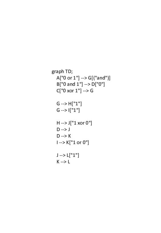 graph TD; A["0 or 1"] --> G[("and")] B["0 and 1"] --> D["0"] C["0 xor 1"] --> G G --> H["1"] G --> I["1"] H --> J["1 xor 0"] D --> J D --> K I --> K["1 or 0"] J --> L["1"] K --> L