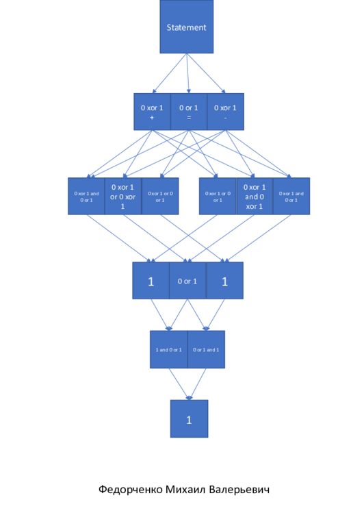 0 xor 1 + 0 or 1 = 0 xor 1 - 0 xor 1 and 0 or 1 0 xor 1 or 0 xor 1 0 xor 1 or 0 or 1 0 xor 1 or 0 or 1 0 xor 1 and 0 xor 1 0 xor 1 and 0 or 1 1 0 or 1 1 1 and 0 or 1 0 or 1 and 1 1 Statement Федорченко Михаил Валерьевич