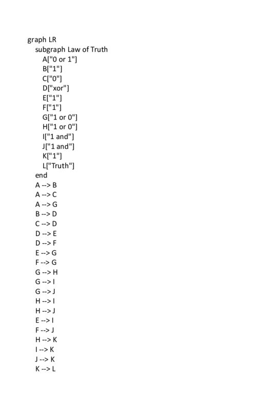 graph LR subgraph Law of Truth A["0 or 1"] B["1"] C["0"] D[" xor "] E["1"] F["1"] G["1 or 0"] H["1 or 0"] I["1 and"] J["1 and"] K["1"] L["Truth"] end A --> B A --> C A --> G B --> D C --> D D --> E D --> F E --> G F --> G G --> H G --> I G --> J H --> I H --> J E --> I F --> J H --> K I --> K J --> K K --> L