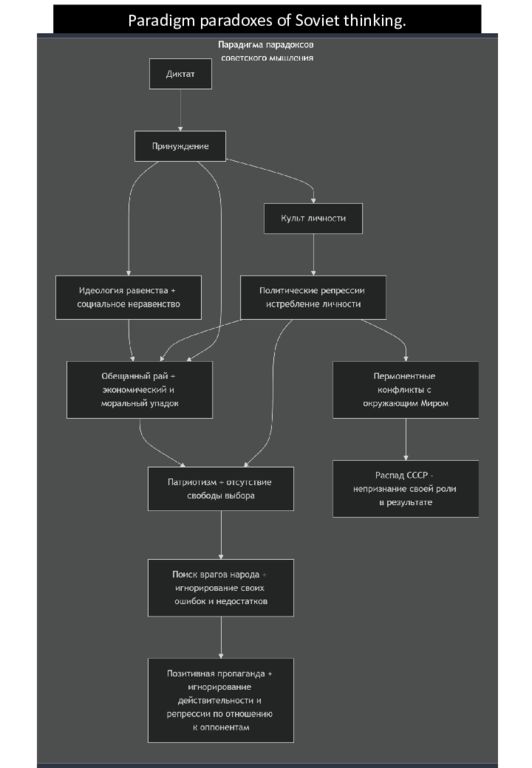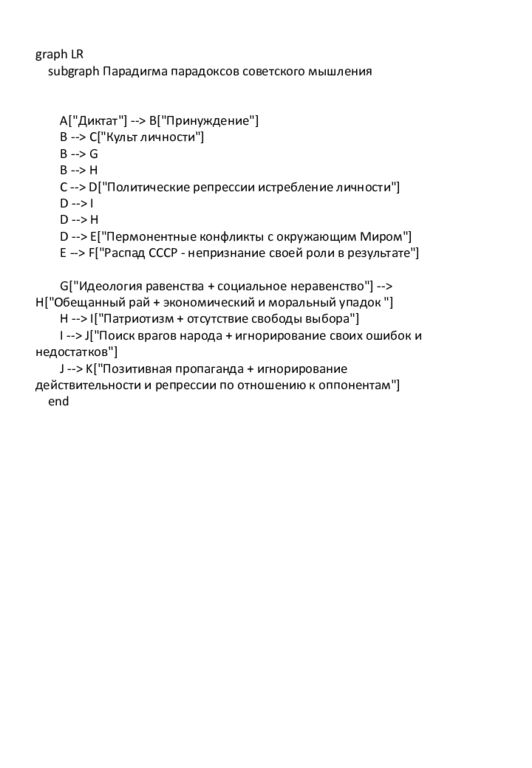 graph LR subgraph Парадигма парадоксов советского мышления A["Диктат"] --> B["Принуждение"] B --> C["Культ личности"] B --> G B --> H C --> D["Политические репрессии истребление личности"] D --> I D --> H D --> E[" Пермонентные конфликты с окружающим Миром"] E --> F["Распад СССР - непризнание своей роли в результате"] G["Идеология равенства + социальное неравенство"] --> H["Обещанный рай + экономический и моральный упадок "] H --> I["Патриотизм + отсутствие свободы выбора"] I --> J["Поиск врагов народа + игнорирование своих ошибок и недостатков"] J --> K["Позитивная пропаганда + игнорирование действительности и репрессии по отношению к оппонентам"] end