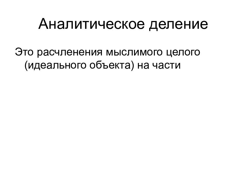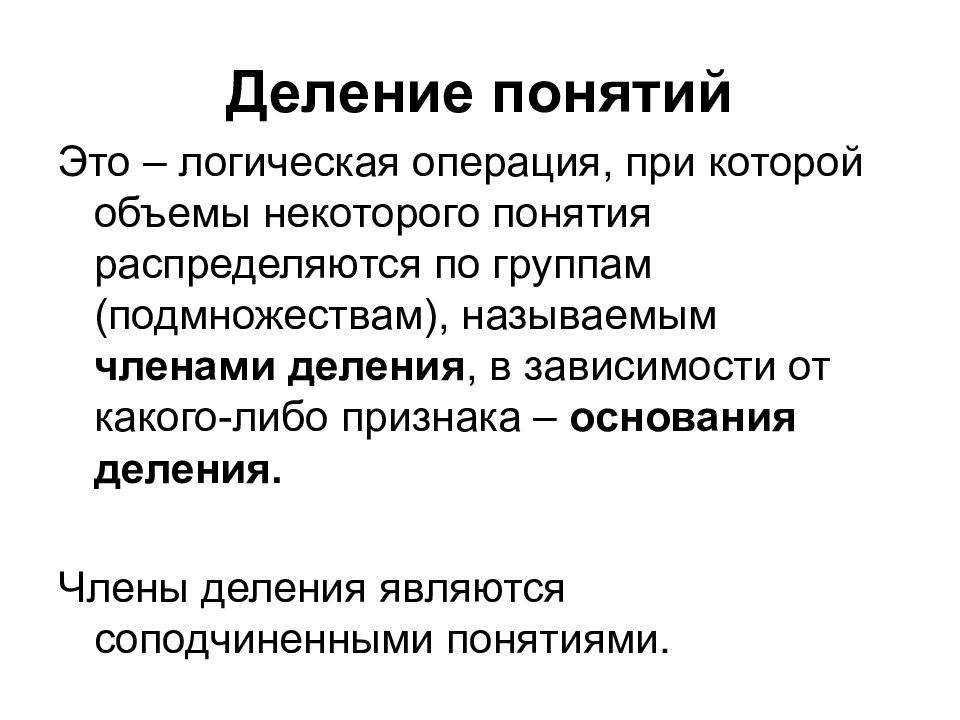 Это – логическая операция, при которой объемы некоторого понятия распределяются по группам (подмножествам), называемым членами деления, в зависимости от какого-либо признака – основания деления. Члены деления являются соподчиненными понятиями.