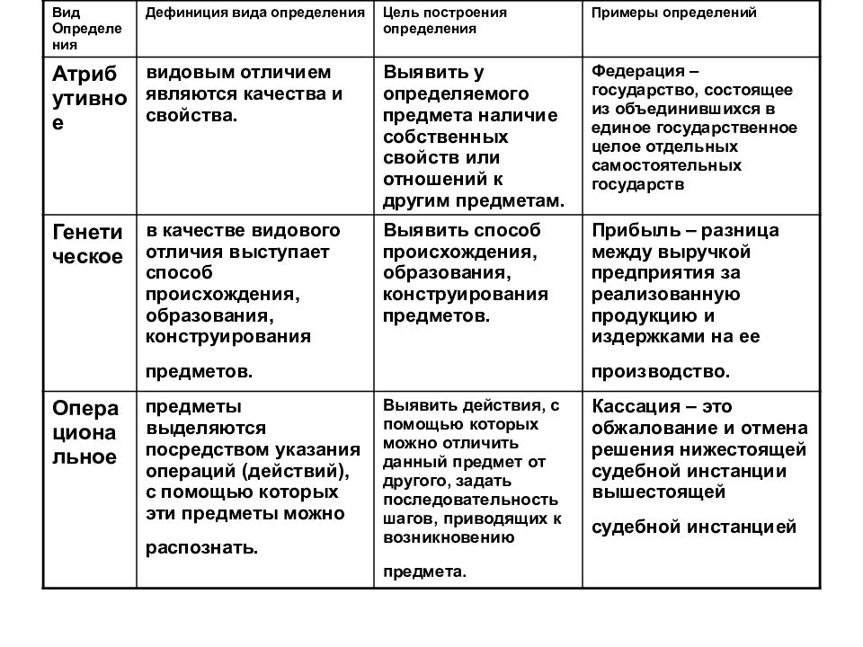 Вид Определения Дефиниция вида определения Цель построения определения Примеры определений Атрибутивное видовым отличием являются качества и свойства. Выявить у определяемого предмета наличие собственных свойств или отношений к другим предметам. Федерация – государство, состоящее из объединившихся в единое государственное целое отдельных самостоятельных государств Генетическое в качестве видового отличия выступает способ происхождения, образования, конструирования предметов. Выявить способ происхождения, образования, конструирования предметов. Прибыль – разница между выручкой предприятия за реализованную продукцию и издержками на ее производство. Операциональное предметы выделяются посредством указания операций (действий), с помощью которых эти предметы можно распознать. Выявить действия, с помощью которых можно отличить данный предмет от другого, задать последовательность шагов, приводящих к возникновению предмета. Кассация – это обжалование и отмена решения нижестоящей судебной инстанции вышестоящей судебной инстанцией