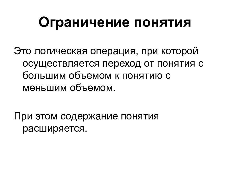 Это логическая операция, при которой осуществляется переход от понятия с большим объемом к понятию с меньшим объемом. При этом содержание понятия расширяется.