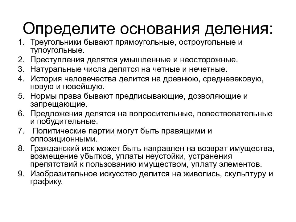 Треугольники бывают прямоугольные, остроугольные и тупоугольные. Преступления делятся умышленные и неосторожные. Натуральные числа делятся на четные и нечетные. История человечества делится на древнюю, средневековую, новую и новейшую. Нормы права бывают предписывающие, дозволяющие и запрещающие. Предложения делятся на вопросительные, повествовательные и побудительные. Политические партии могут быть правящими и оппозиционными. Гражданский иск может быть направлен на возврат имущества, возмещение убытков, уплаты неустойки, устранения препятствий к пользованию имуществом, уплату элементов. Изобразительное искусство делится на живопись, скульптуру и графику.