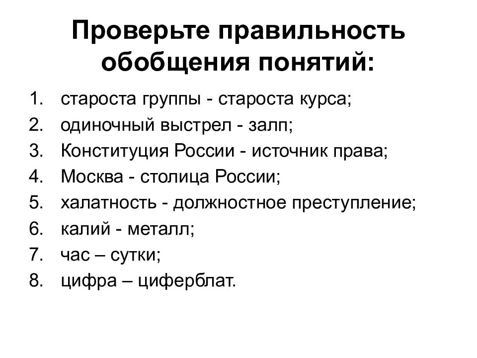 староста группы - староста курса; одиночный выстрел - залп; Конституция России - источник права; Москва - столица России; халатность - должностное преступление; калий - металл; час – сутки; цифра – циферблат.