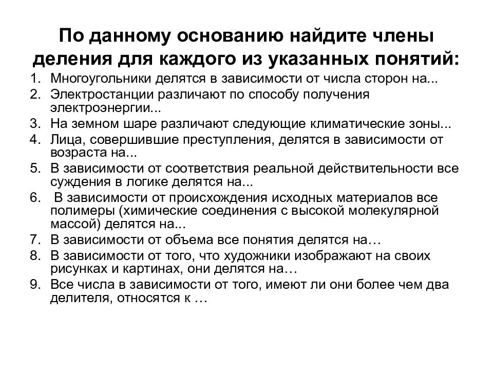 Слайд 20: По данному основанию найдите члены деления для каждого из указанных понятий: