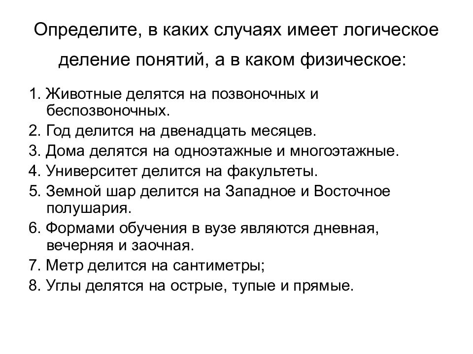 Слайд 17: Определите, в каких случаях имеет логическое деление понятий, а в каком физическое: