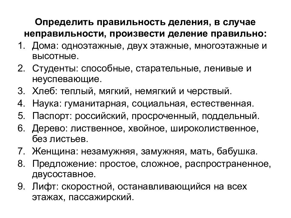 Дома: одноэтажные, двух этажные, многоэтажные и высотные. Студенты: способные, старательные, ленивые и неуспевающие. Хлеб: теплый, мягкий, немягкий и черствый. Наука: гуманитарная, социальная, естественная. Паспорт: российский, просроченный, поддельный. Дерево: лиственное, хвойное, широколиственное, без листьев. Женщина: незамужняя, замужняя, мать, бабушка. Предложение: простое, сложное, распространенное, двусоставное. Лифт: скоростной, останавливающийся на всех этажах, пассажирский.