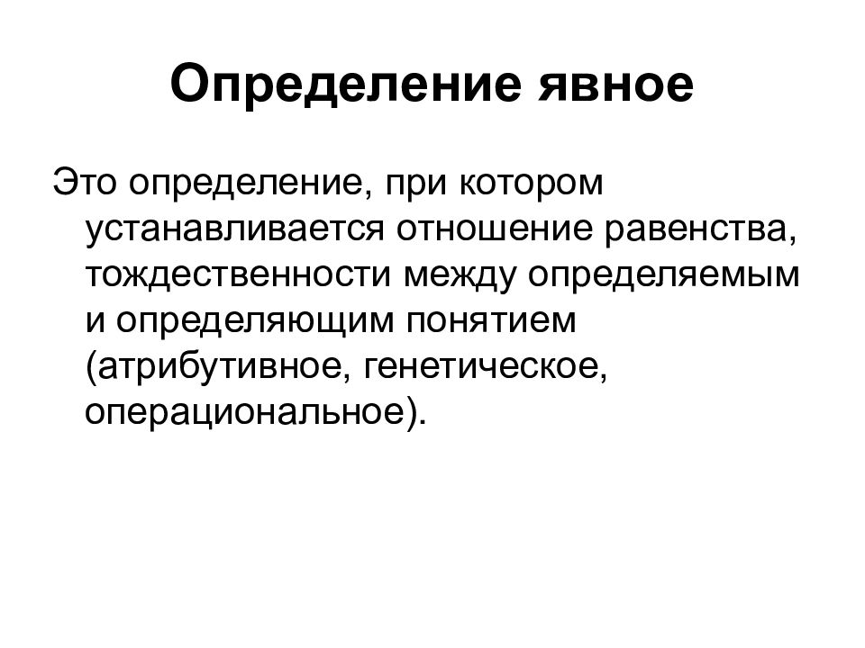 Это определение, при котором устанавливается отношение равенства, тождественности между определяемым и определяющим понятием (атрибутивное, генетическое, операциональное).