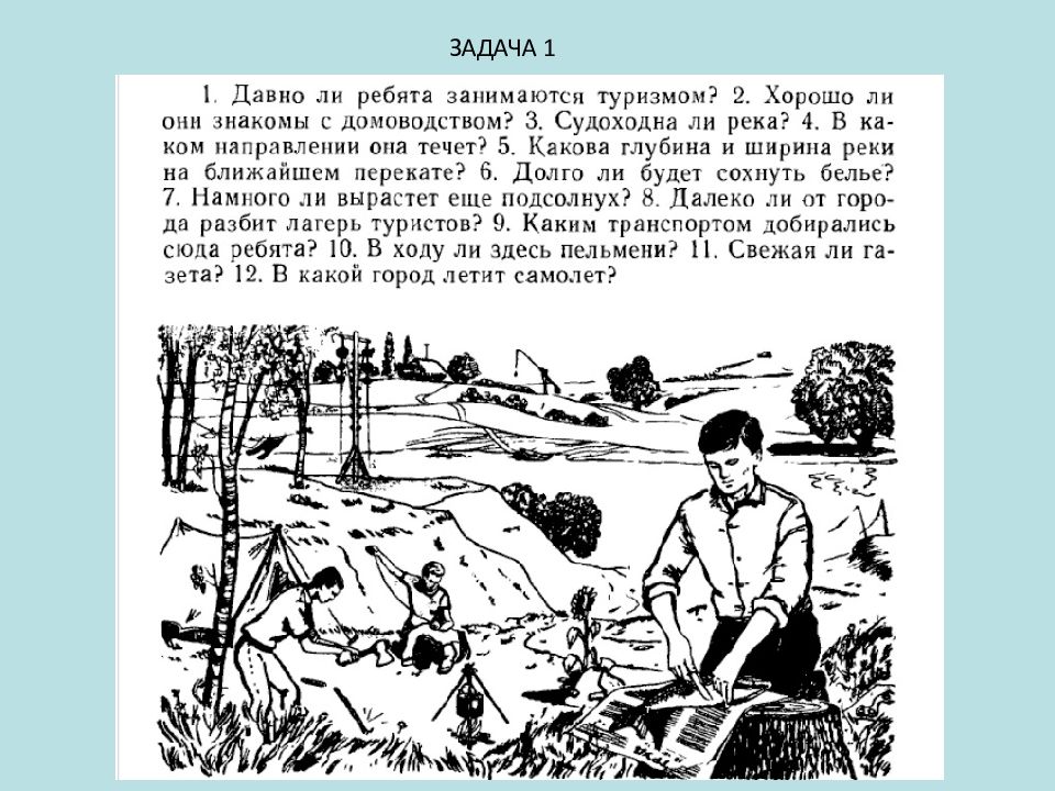 1. Сколько туристов живет в этом лагере? 2. Когда они сюда приехали: сегодня или несколько дней назад? 3. На чем они сюда приехали? 4. Далеко ли от лагеря до ближайшего селения? 5. Откуда дует ветер: с севера или юга? 6. Какое сейчас время дня? 7. Куда ушел Шура? 8. Кто был вчера дежурным? (Назовите по имени.) 9. Какое сегодня число какого месяца? ЗАДАЧА 6