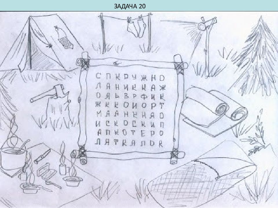 Вопросы к кроссворду По вертикали: 1. Получение белков, жиров, углеводов 2.Время, когда можно «вытянуть ноги» 3. Походная кастрюля 4. Направление похода 5.По нему переходят реку 6.Без него туристу просто нельзя 7. Чем больше дров, тем ярче 8. Он всегда укажет правильное направление 9. Приспособление для натягивания переправы 10. Туристическая «вылазка» По горизонтали: 10. Ее натягивают над пропастью 11. Угол между плоскостью меридиана точки наблюдения и вертикальной плоскостью 12. Начало соревнований 13. Любитель ходить в походы 14. Место для ночлега 15. Туристический «чемодан» 16. Туристический лагерь ЗАДАЧА 19