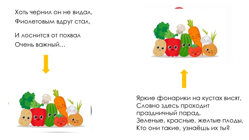 Хоть чернил он не видал, Фиолетовым вдруг стал, И лоснится от похвал Очень важный… Яркие фонарики на кустах висят, Словно здесь проходит праздничный парад. Зеленые, красные, желтые плоды, Кто они такие, узнаёшь их ты?