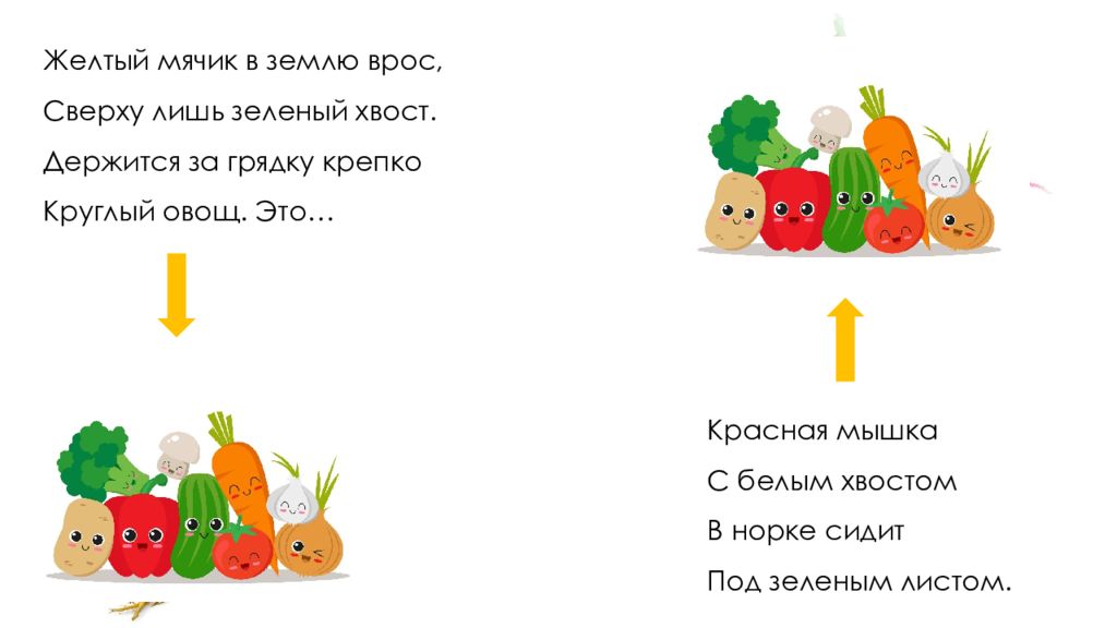Слайд 6: Желтый мячик в землю врос, Сверху лишь зеленый хвост. Держится за грядку крепко Круглый овощ. Это…