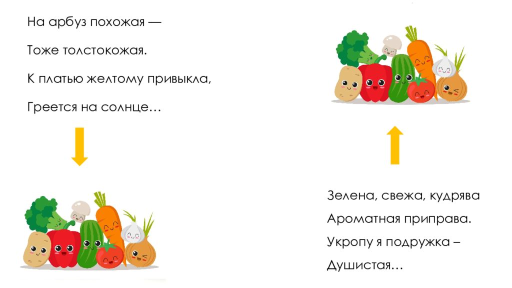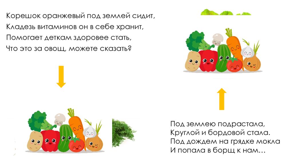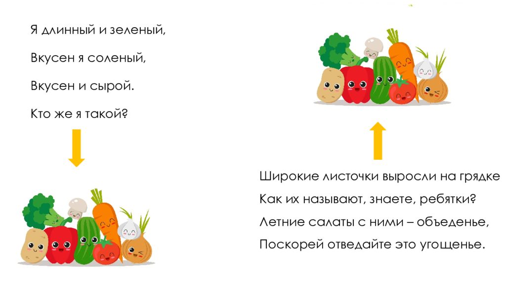 Я длинный и зеленый, В кусен я соленый, Вкусен и сырой. Кто же я такой? Широкие листочки выросли на грядке Как их называют, знаете, ребятки? Летние салаты с ними – объеденье, Поскорей отведайте это угощенье.