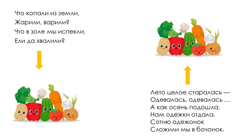 Что копали из земли, Жарили, варили? Что в золе мы испекли, Ели да хвалили? Лето целое старалась — Одевалась, одевалась … А как осень подошла, Нам одежки отдала. Сотню одежонок Сложили мы в бочонок.