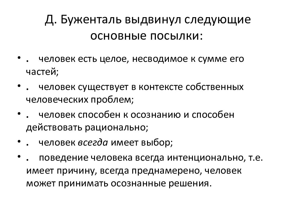 Слайд 9: Д. Буженталь выдвинул следующие основные посылки: