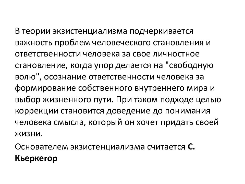 В теории экзистенциализма подчеркивается важность проблем человеческого становления и ответственности человека за свое личностное становление, когда упор делается на "свободную волю", осознание ответственности человека за формирование собственного внутреннего мира и выбор жизненного пути. При таком подходе целью коррекции становится доведение до понимания человека смысла, который он хочет придать своей жизни. Основателем экзистенциализма считается С. Кьеркегор