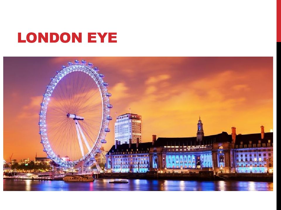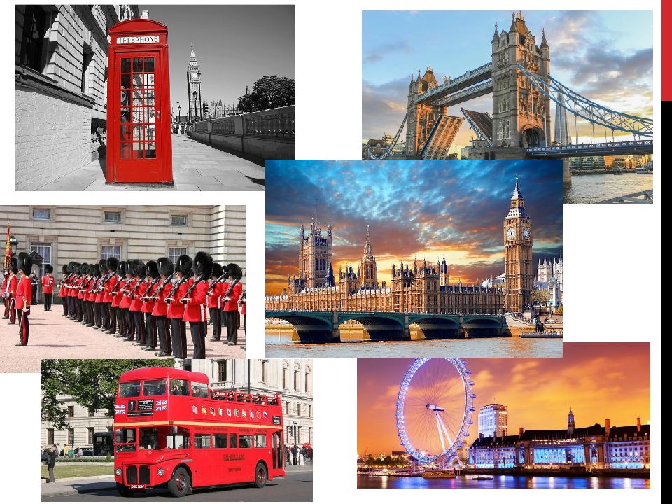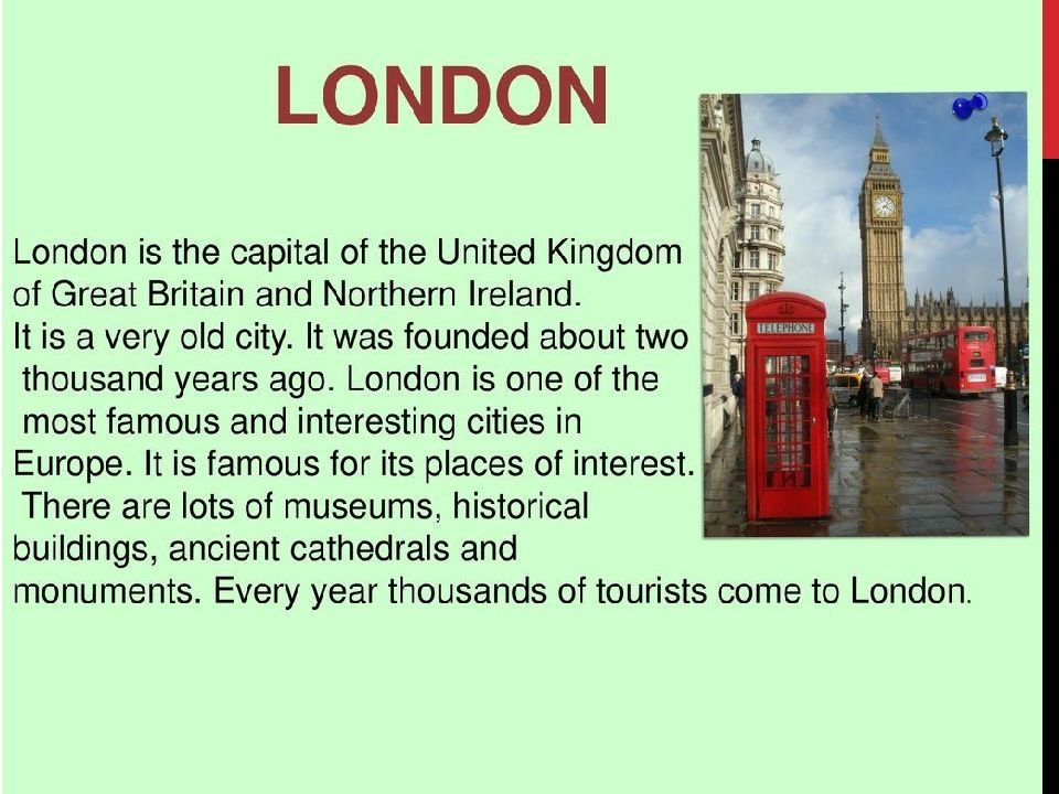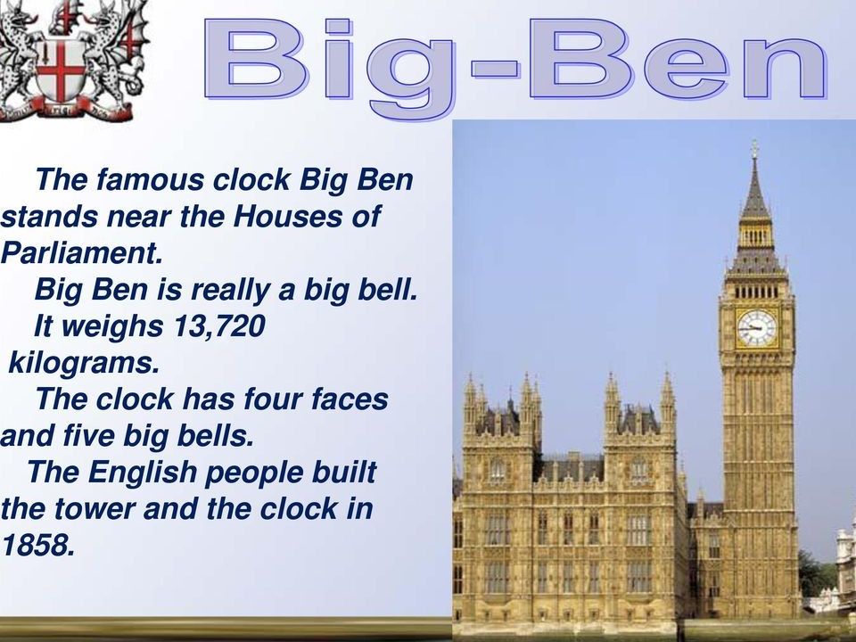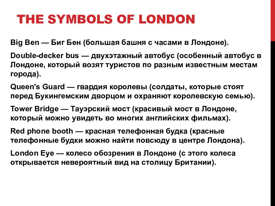 Big Ben — Биг Бен (большая башня с часами в Лондоне ). Double-decker bus — двухэтажный автобус (особенный автобус в Лондоне, который возят туристов по разным известным местам города ). Queen's Guard — гвардия королевы (солдаты, которые стоят перед Букингемским дворцом и охраняют королевскую семью ). Tower Bridge — Тауэрский мост (красивый мост в Лондоне, который можно увидеть во многих английских фильмах ). Red phone booth — красная телефонная будка (красные телефонные будки можно найти повсюду в центре Лондона ). London Eye — колесо обозрения в Лондоне (с этого колеса открывается невероятный вид на столицу Британии).