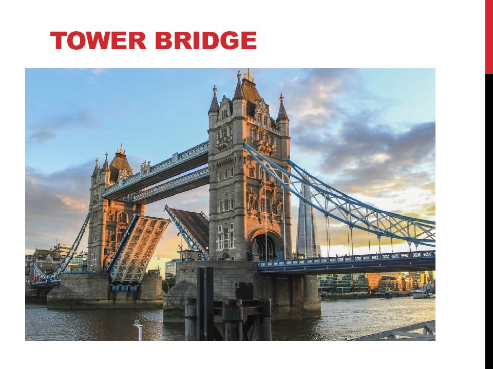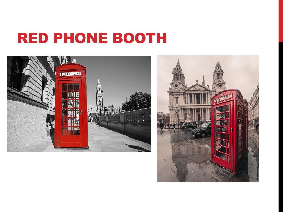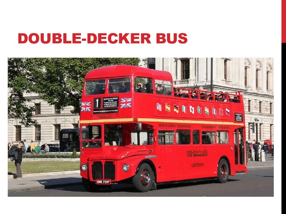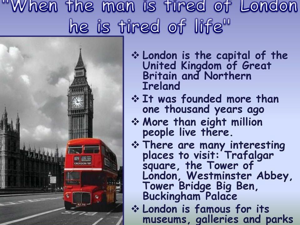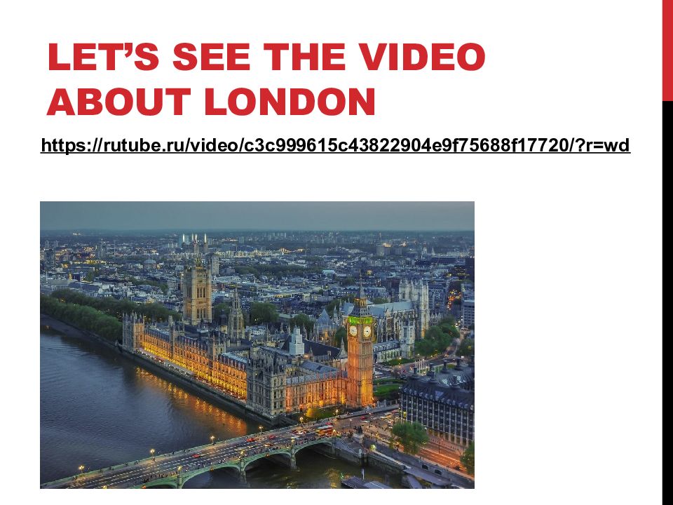 Big Ben — Биг Бен (большая башня с часами в Лондоне ). Double-decker bus — двухэтажный автобус (особенный автобус в Лондоне, который возят туристов по разным известным местам города ). Queen's Guard — гвардия королевы (солдаты, которые стоят перед Букингемским дворцом и охраняют королевскую семью ). Tower Bridge — Тауэрский мост (красивый мост в Лондоне, который можно увидеть во многих английских фильмах ). Red phone booth — красная телефонная будка (красные телефонные будки можно найти повсюду в центре Лондона ). London Eye — колесо обозрения в Лондоне (с этого колеса открывается невероятный вид на столицу Британии).