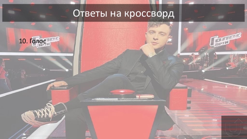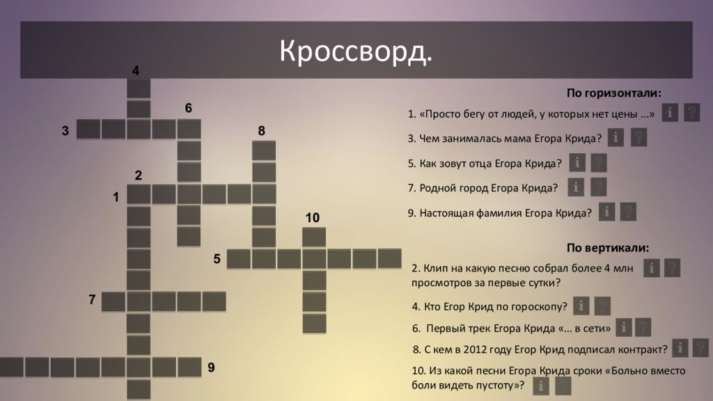1 2 3 4 5 6 7 8 9 10 3. Чем занималась мама Егора Крида ? По горизонтали: 1. «Просто бегу от людей, у которых нет цены …» 5. Как зовут отца Егора Крида ? 7. Родной город Егора Крида ? 9. Настоящая фамилия Егора Крида ? По вертикали: 2. Клип на какую песню собрал более 4 млн просмотров за первые сутки? 4. Кто Егор Крид по гороскопу? 6. Первый трек Егора Крида «… в сети» 8. С кем в 2012 году Егор Крид подписал контракт? 10. Из какой песни Егора Крида сроки «Больно вместо боли видеть пустоту»?