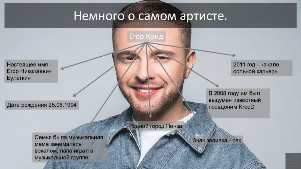 Егор Крид Настоящее имя - Его́р Никола́евич Була́ткин Дата рождения 25.06.1994 Родной город Пенза Знак зодиака - рак В 2008 году им был выдуман известный псевдоним KreeD Семья была музыкальная: мама занималась вокалом, папа играл в музыкальной группе. 2011 год - н ачало сольной карьеры