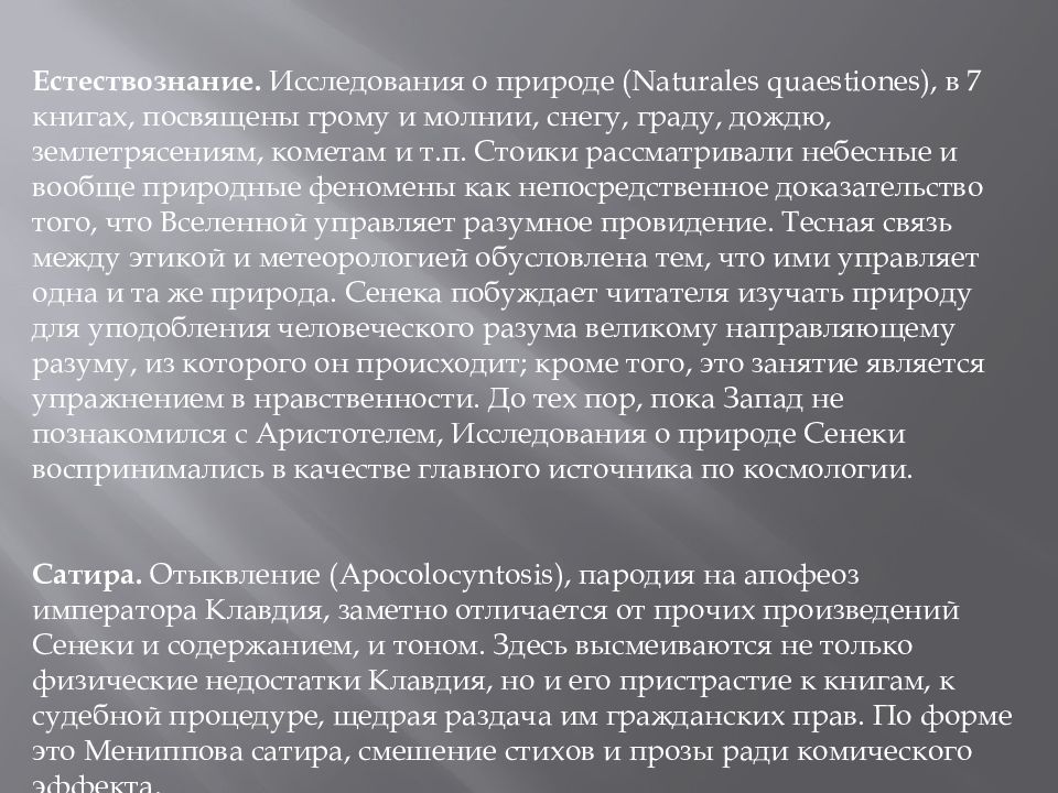 Естествознание. Исследования о природе ( Naturales quaestiones ), в 7 книгах, посвящены грому и молнии, снегу, граду, дождю, землетрясениям, кометам и т.п. Стоики рассматривали небесные и вообще природные феномены как непосредственное доказательство того, что Вселенной управляет разумное провидение. Тесная связь между этикой и метеорологией обусловлена тем, что ими управляет одна и та же природа. Сенека побуждает читателя изучать природу для уподобления человеческого разума великому направляющему разуму, из которого он происходит; кроме того, это занятие является упражнением в нравственности. До тех пор, пока Запад не познакомился с Аристотелем, Исследования о природе Сенеки воспринимались в качестве главного источника по космологии. Сатира. Отыквление ( Apocolocyntosis ), пародия на апофеоз императора Клавдия, заметно отличается от прочих произведений Сенеки и содержанием, и тоном. Здесь высмеиваются не только физические недостатки Клавдия, но и его пристрастие к книгам, к судебной процедуре, щедрая раздача им гражданских прав. По форме это Мениппова сатира, смешение стихов и прозы ради комического эффекта.