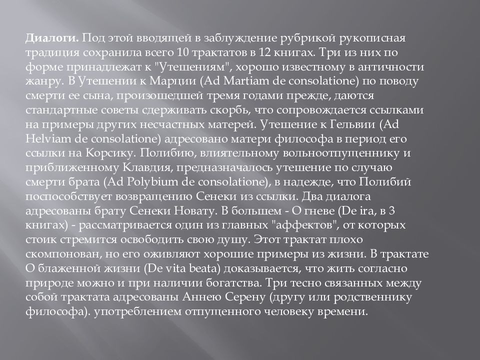 Диалоги. Под этой вводящей в заблуждение рубрикой рукописная традиция сохранила всего 10 трактатов в 12 книгах. Три из них по форме принадлежат к "Утешениям", хорошо известному в античности жанру. В Утешении к Марции ( Ad Martiam de consolatione ) по поводу смерти ее сына, произошедшей тремя годами прежде, даются стандартные советы сдерживать скорбь, что сопровождается ссылками на примеры других несчастных матерей. Утешение к Гельвии ( Ad Helviam de consolatione ) адресовано матери философа в период его ссылки на Корсику. Полибию, влиятельному вольноотпущеннику и приближенному Клавдия, предназначалось утешение по случаю смерти брата ( Ad Polybium de consolatione ), в надежде, что Полибий поспособствует возвращению Сенеки из ссылки. Два диалога адресованы брату Сенеки Новату. В большем - О гневе ( De ira, в 3 книгах) - рассматривается один из главных "аффектов", от которых стоик стремится освободить свою душу. Этот трактат плохо скомпонован, но его оживляют хорошие примеры из жизни. В трактате О блаженной жизни ( De vita beata ) доказывается, что жить согласно природе можно и при наличии богатства. Три тесно связанных между собой трактата адресованы Аннею Серену (другу или родственнику философа). употреблением отпущенного человеку времени.