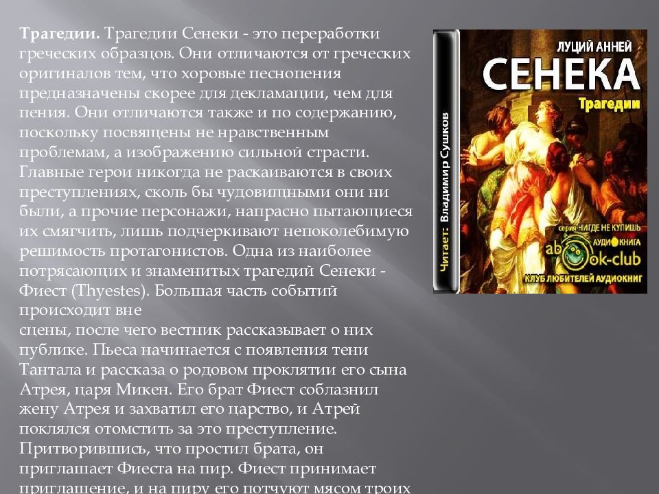 Трагедии. Трагедии Сенеки - это переработки греческих образцов. Они отличаются от греческих оригиналов тем, что хоровые песнопения предназначены скорее для декламации, чем для пения. Они отличаются также и по содержанию, поскольку посвящены не нравственным проблемам, а изображению сильной страсти. Главные герои никогда не раскаиваются в своих преступлениях, сколь бы чудовищными они ни были, а прочие персонажи, напрасно пытающиеся их смягчить, лишь подчеркивают непоколебимую решимость протагонистов. Одна из наиболее потрясающих и знаменитых трагедий Сенеки - Фиест ( Thyestes ). Большая часть событий происходит вне сцены, после чего вестник рассказывает о них публике. Пьеса начинается с появления тени Тантала и рассказа о родовом проклятии его сына Атрея, царя Микен. Его брат Фиест соблазнил жену Атрея и захватил его царство, и Атрей поклялся отомстить за это преступление. Притворившись, что простил брата, он приглашает Фиеста на пир. Фиест принимает приглашение, и на пиру его потчуют мясом троих его сыновей, убитых Атреем. Драма завершается тем, что Атрей открывает брату истину.