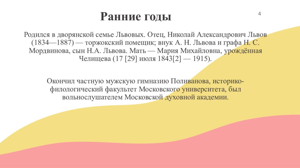 Родился в дворянской семье Львовых. Отец, Николай Александрович Львов (1834—1887) — торжокский помещик; внук А. Н. Львова и графа Н. С. Мордвинова, сын Н.А. Львова. Мать — Мария Михайловна, урождённая Челищева (17 [29] июля 1843[2] — 1915). Окончил частную мужскую гимназию Поливанова, историко-филологический факультет Московского университета, был вольнослушателем Московской духовной академии. 4