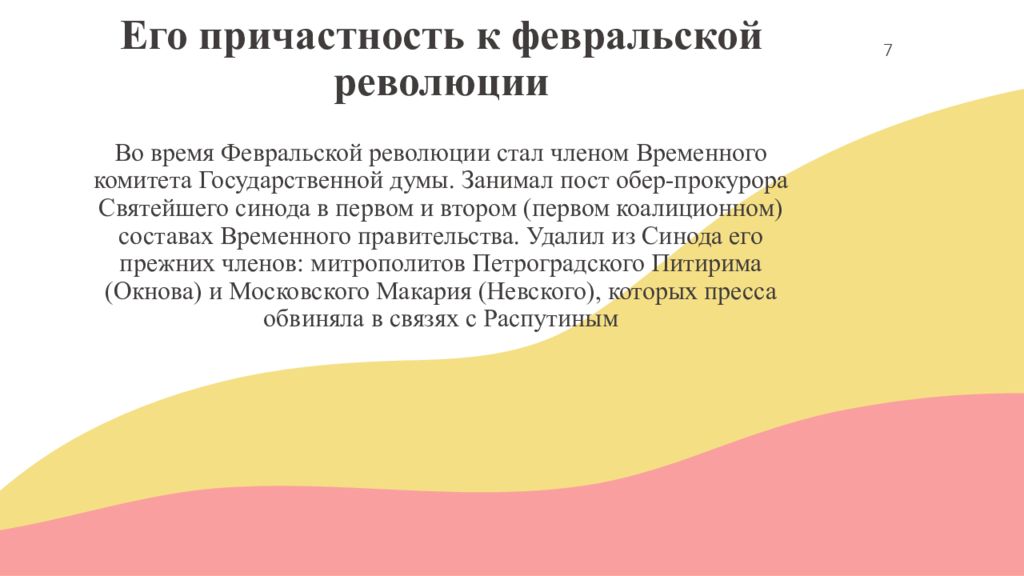 Во время Февральской революции стал членом Временного комитета Государственной думы. Занимал пост обер-прокурора Святейшего синода в первом и втором (первом коалиционном) составах Временного правительства. Удалил из Синода его прежних членов: митрополитов Петроградского Питирима (Окнова) и Московского Макария (Невского), которых пресса обвиняла в связях с Распутиным 7