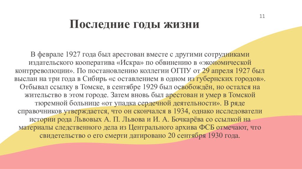 В феврале 1927 года был арестован вместе с другими сотрудниками издательского кооператива «Искра» по обвинению в «экономической контрреволюции». По постановлению коллегии ОГПУ от 29 апреля 1927 был выслан на три года в Сибирь «с оставлением в одном из губернских городов». Отбывал ссылку в Томске, в сентябре 1929 был освобождён, но остался на жительство в этом городе. Затем вновь был арестован и умер в Томской тюремной больнице «от упадка сердечной деятельности». В ряде справочников утверждается, что он скончался в 1934, однако исследователи истории рода Львовых А. П. Львова и И. А. Бочкарёва со ссылкой на материалы следственного дела из Центрального архива ФСБ отмечают, что свидетельство о его смерти датировано 20 сентября 1930 года. 11