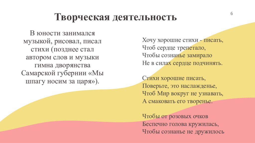 В юности занимался музыкой, рисовал, писал стихи (позднее стал автором слов и музыки гимна дворянства Самарской губернии «Мы шпагу носим за царя»). 6 Хочу хорошие стихи - писать, Чтоб сердце трепетало, Чтобы сознанье замирало Не в силах сердце подчинять. Стихи хорошие писать, Поверьте, это наслажденье, Чтоб Мир вокруг не узнавать, А смаковать его творенье. Чтобы от розовых очков Беспечно голова кружилась, Чтобы сознанье не дружилось