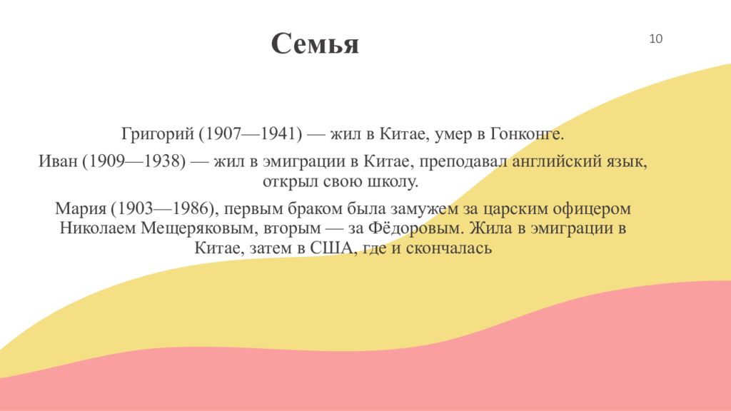 Григорий (1907—1941) — жил в Китае, умер в Гонконге. Иван (1909—1938) — жил в эмиграции в Китае, преподавал английский язык, открыл свою школу. Мария (1903—1986), первым браком была замужем за царским офицером Николаем Мещеряковым, вторым — за Фёдоровым. Жила в эмиграции в Китае, затем в США, где и скончалась 10