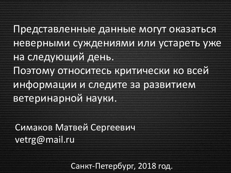 Симаков Матвей Сергеевич vetrg@mail.ru Представленные данные могут оказаться неверными суждениями или устареть уже на следующий день. Поэтому относитесь критически ко всей информации и следите за развитием ветеринарной науки. Санкт-Петербург, 2018 год.