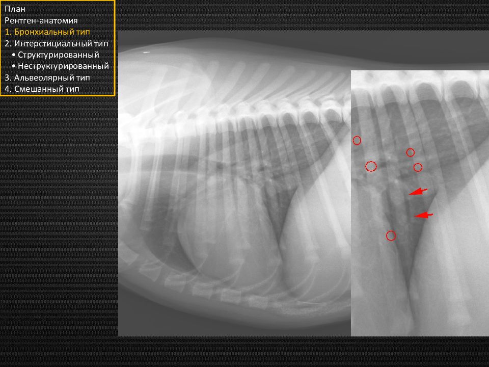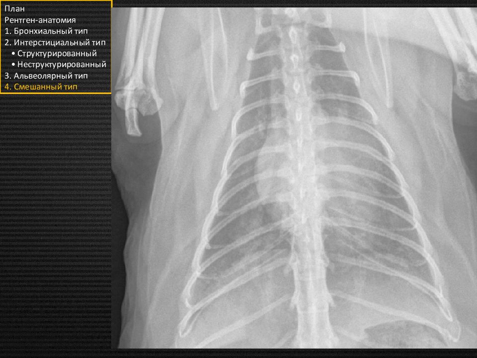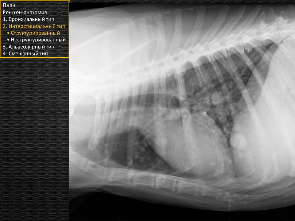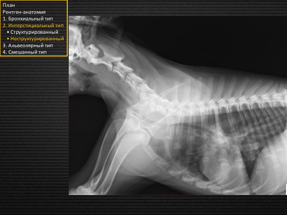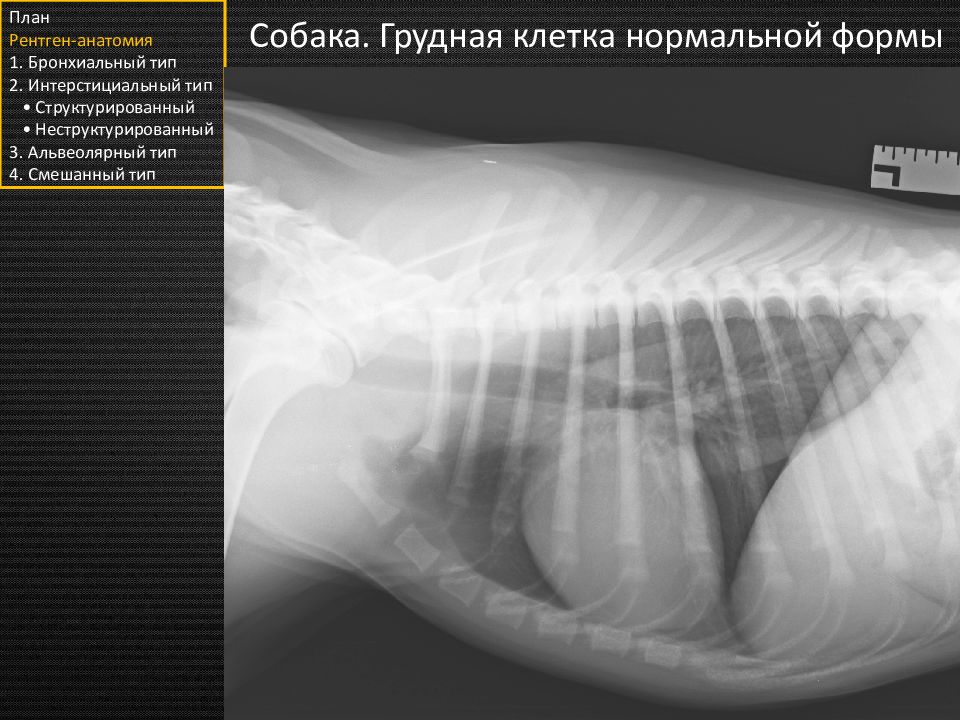 Собака. Грудная клетка нормальной формы План Рентген-анатомия 1. Бронхиальный тип 2. Интерстициальный тип • Структурированный • Неструктурированный 3. Альвеолярный тип 4. Смешанный тип