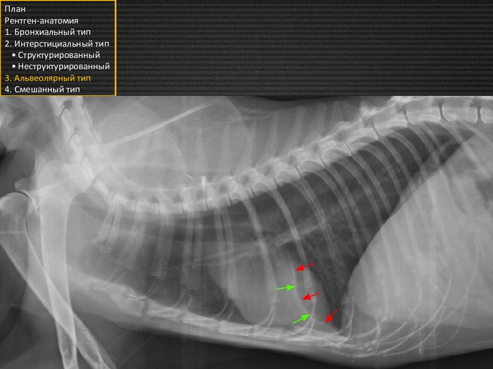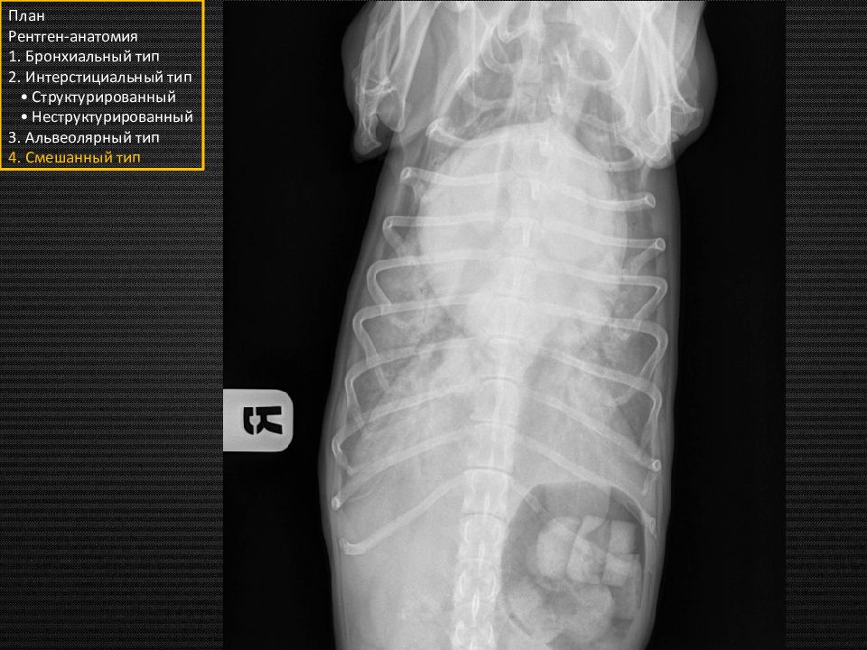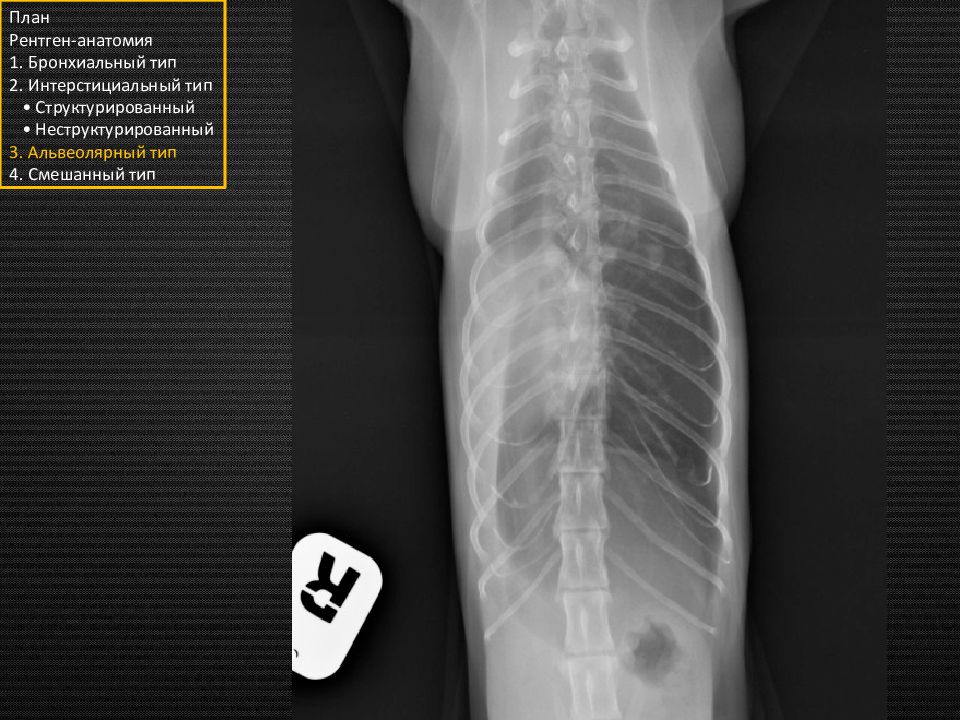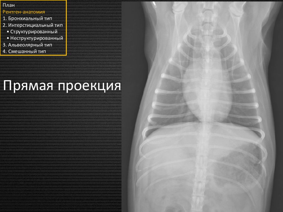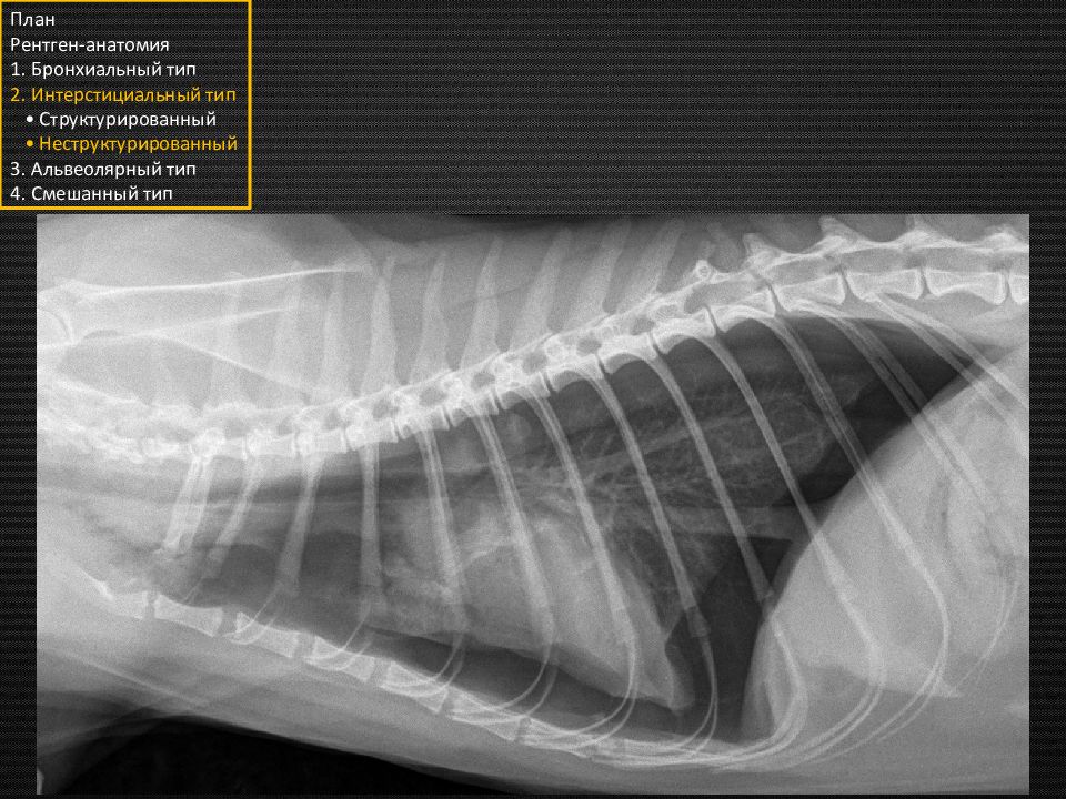 Собака. Грудная клетка нормальной формы План Рентген-анатомия 1. Бронхиальный тип 2. Интерстициальный тип • Структурированный • Неструктурированный 3. Альвеолярный тип 4. Смешанный тип