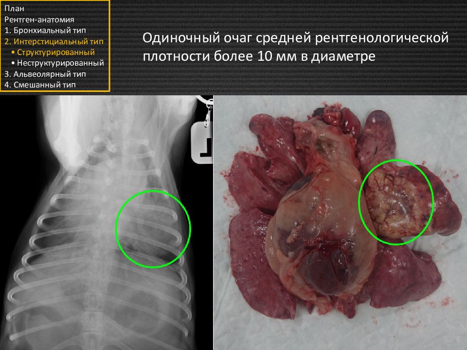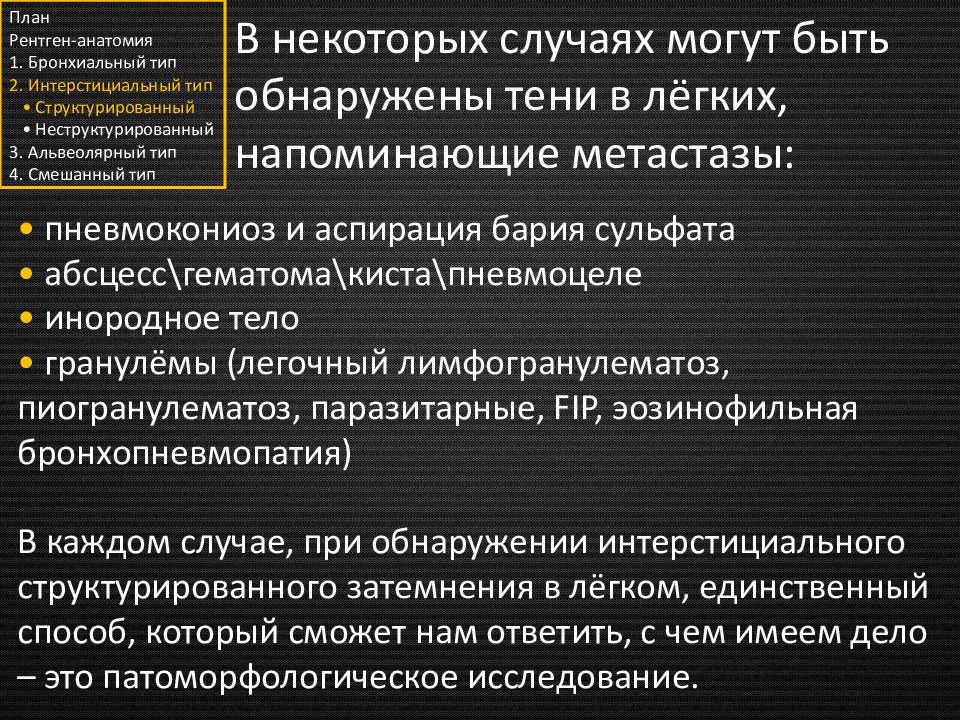 В некоторых случаях могут быть обнаружены тени в лёгких, напоминающие метастазы: План Рентген-анатомия 1. Бронхиальный тип 2. Интерстициальный тип • Структурированный • Неструктурированный 3. Альвеолярный тип 4. Смешанный тип • пневмокониоз и аспирация бария сульфата • абсцесс\гематома\киста\ пневмоцеле • инородное тело • гранулёмы (легочный лимфогранулематоз, пиогранулематоз, паразитарные, FIP, эозинофильная бронхопневмопатия ) В каждом случае, при обнаружении интерстициального структурированного затемнения в лёгком, единственный способ, который сможет нам ответить, с чем имеем дело – это патоморфологическое исследование.