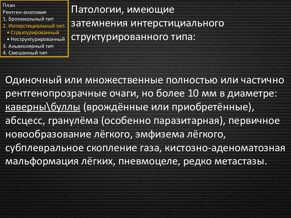 Патологии, имеющие затемнения интерстициального структурированного типа: План Рентген-анатомия 1. Бронхиальный тип 2. Интерстициальный тип • Структурированный • Неструктурированный 3. Альвеолярный тип 4. Смешанный тип Одиночный или множественные полностью или частично рентгенопрозрачные очаги, но более 10 мм в диаметре: каверны\буллы (врождённые или приобретённые), абсцесс, гранулёма (особенно паразитарная), первичное новообразование лёгкого, эмфизема лёгкого, субплевральное скопление газа, кистозно-аденоматозная мальформация лёгких, пневмоцеле, редко метастазы.