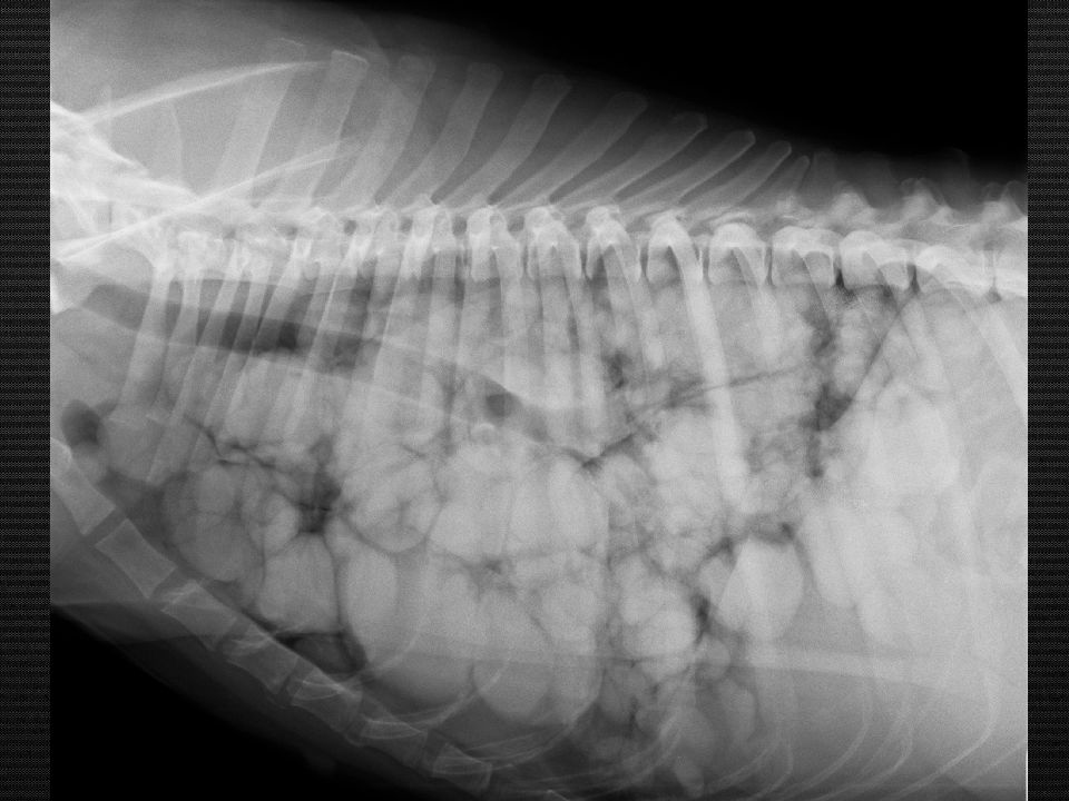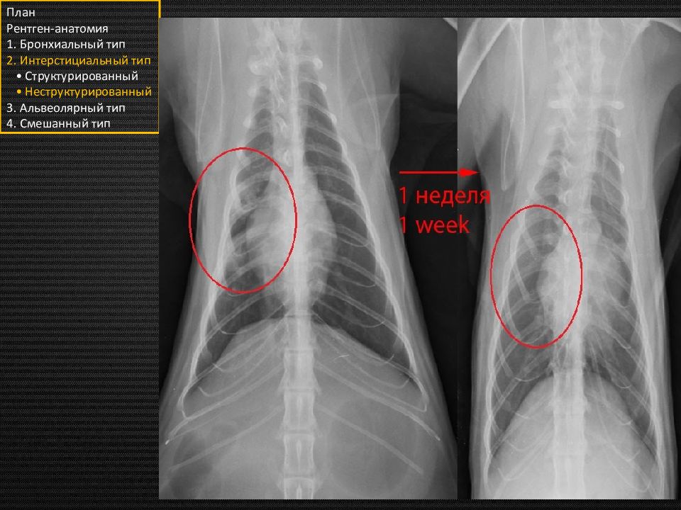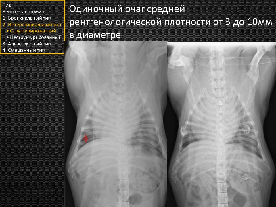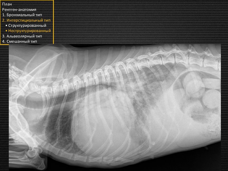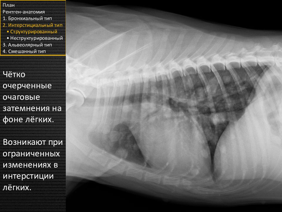 Патологии, имеющие затемнения интерстициального структурированного типа: План Рентген-анатомия 1. Бронхиальный тип 2. Интерстициальный тип • Структурированный • Неструктурированный 3. Альвеолярный тип 4. Смешанный тип Множественные очаги средней рентгенологической плотности от 3 до 10мм в диаметре: метастатическая болезнь лёгких, тени долевых сосудов лёгких, обращённых в сторону излучателя, грибковая или паразитарная пневмония, обструктивная форма болезни бронхов кошек, суперпозиция прочих структур ( соски, кожные новообразования, минерализованные рёберные хрящи ), артефакты, пневмокониоз, токсоплазмоз, лептоспироз, туляремия, туберкулёз, септическая эмболия, ДВС, диссеминированный тип роста новообразования (например, лимфома лёгкого), гранулёмы ( лимфогранулематоз, пиогранулематоз )