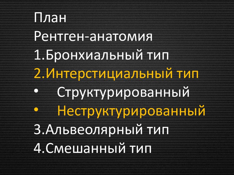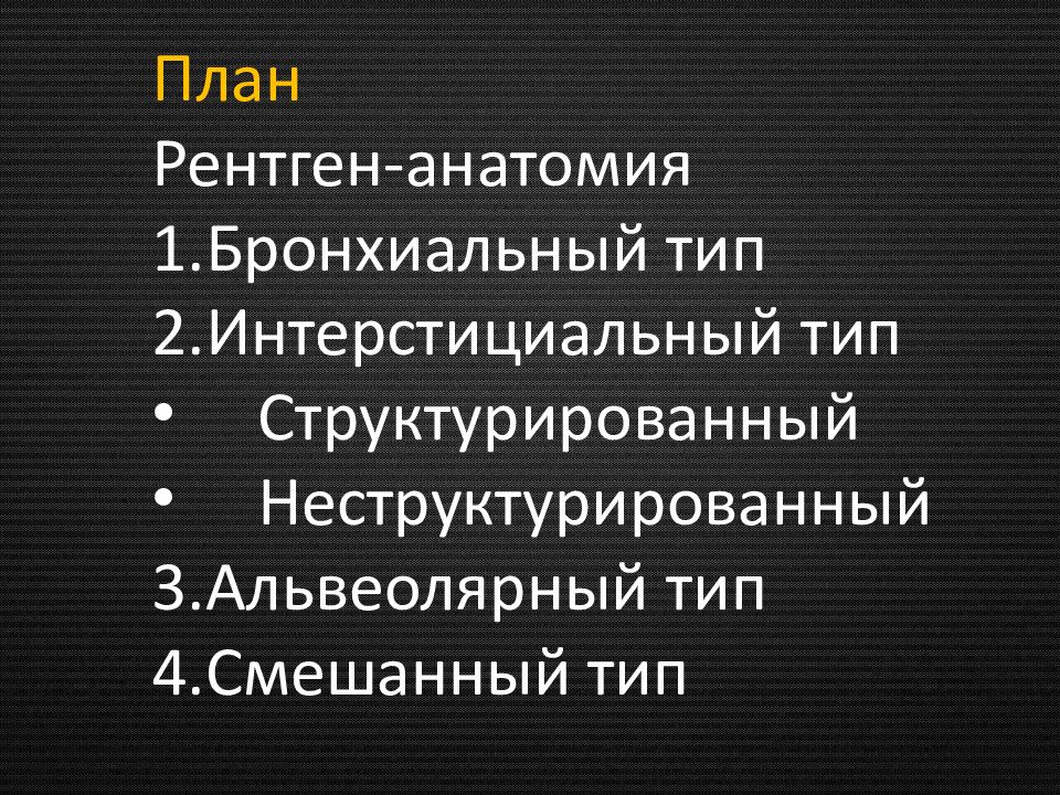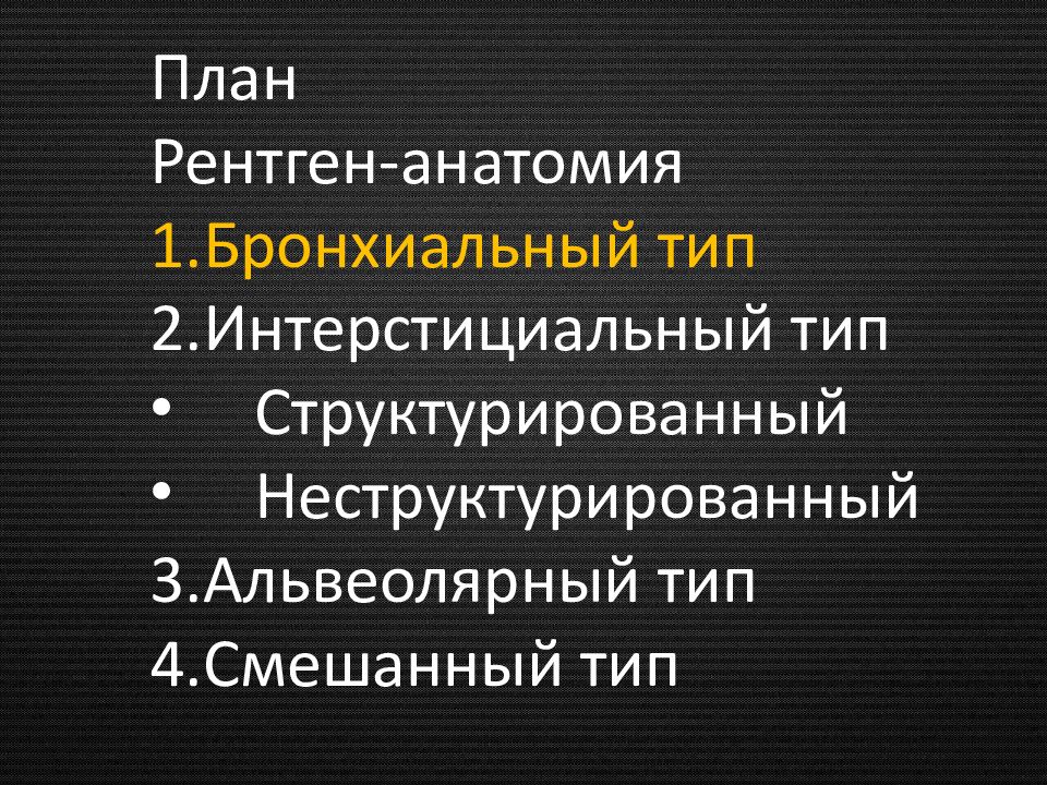 План Рентген-анатомия 1. Бронхиальный тип 2. Интерстициальный тип • Структурированный • Неструктурированный 3. Альвеолярный тип 4. Смешанный тип