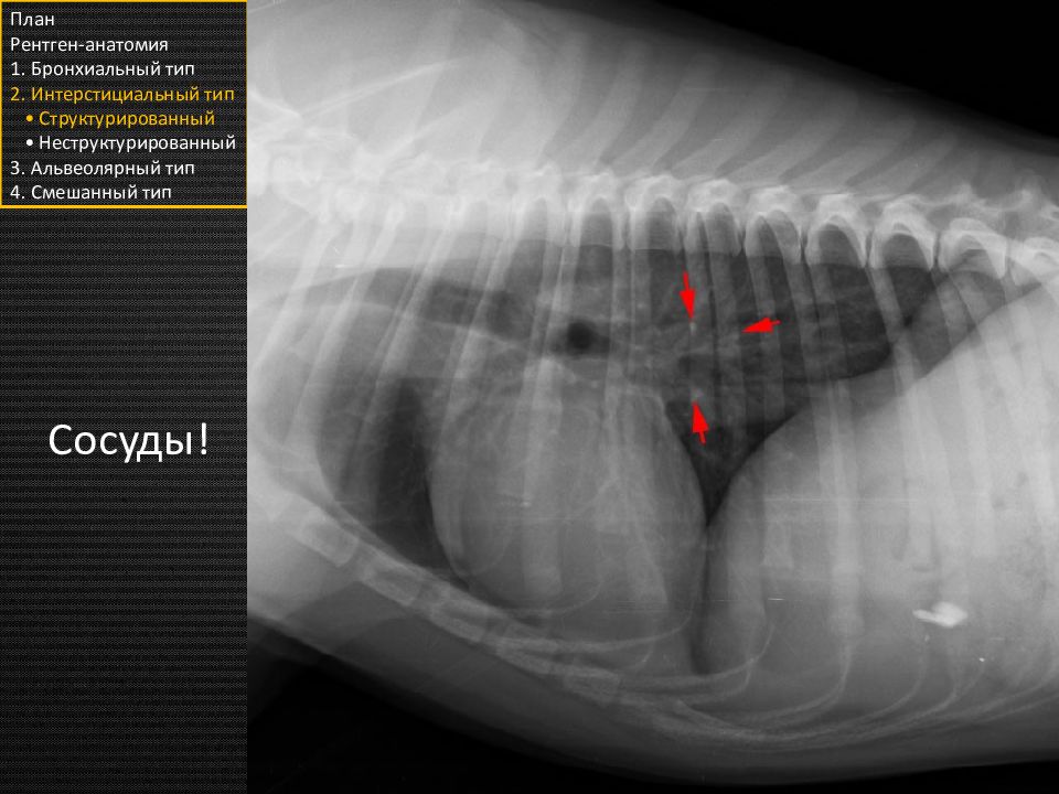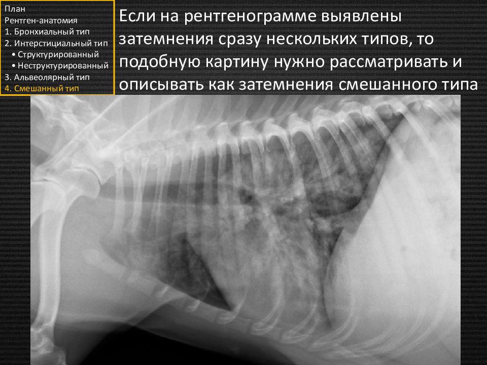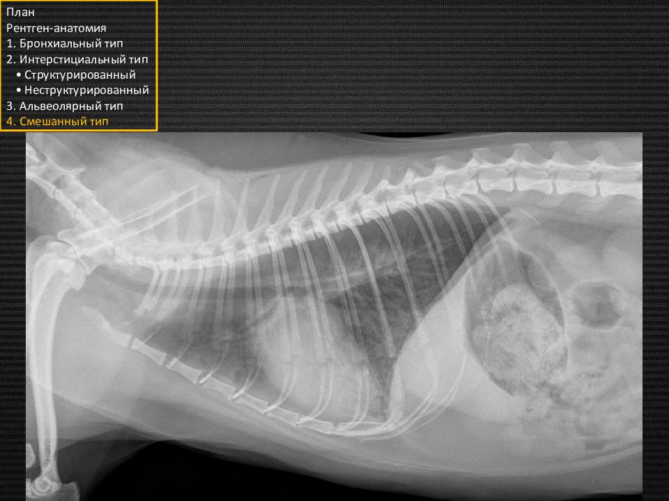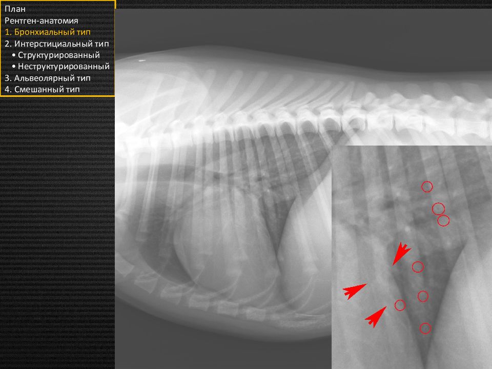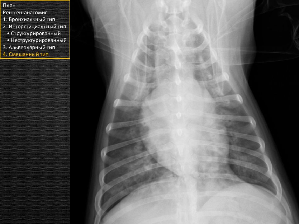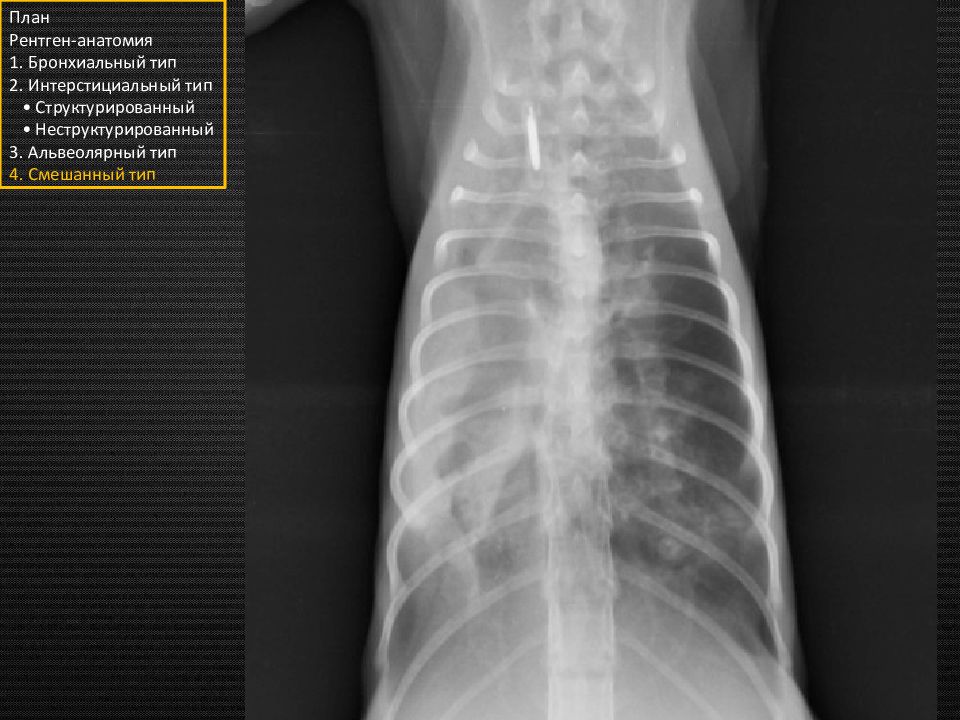 У кошек всё тоже самое, но в ещё большей миниатюре План Рентген-анатомия 1. Бронхиальный тип 2. Интерстициальный тип • Структурированный • Неструктурированный 3. Альвеолярный тип 4. Смешанный тип